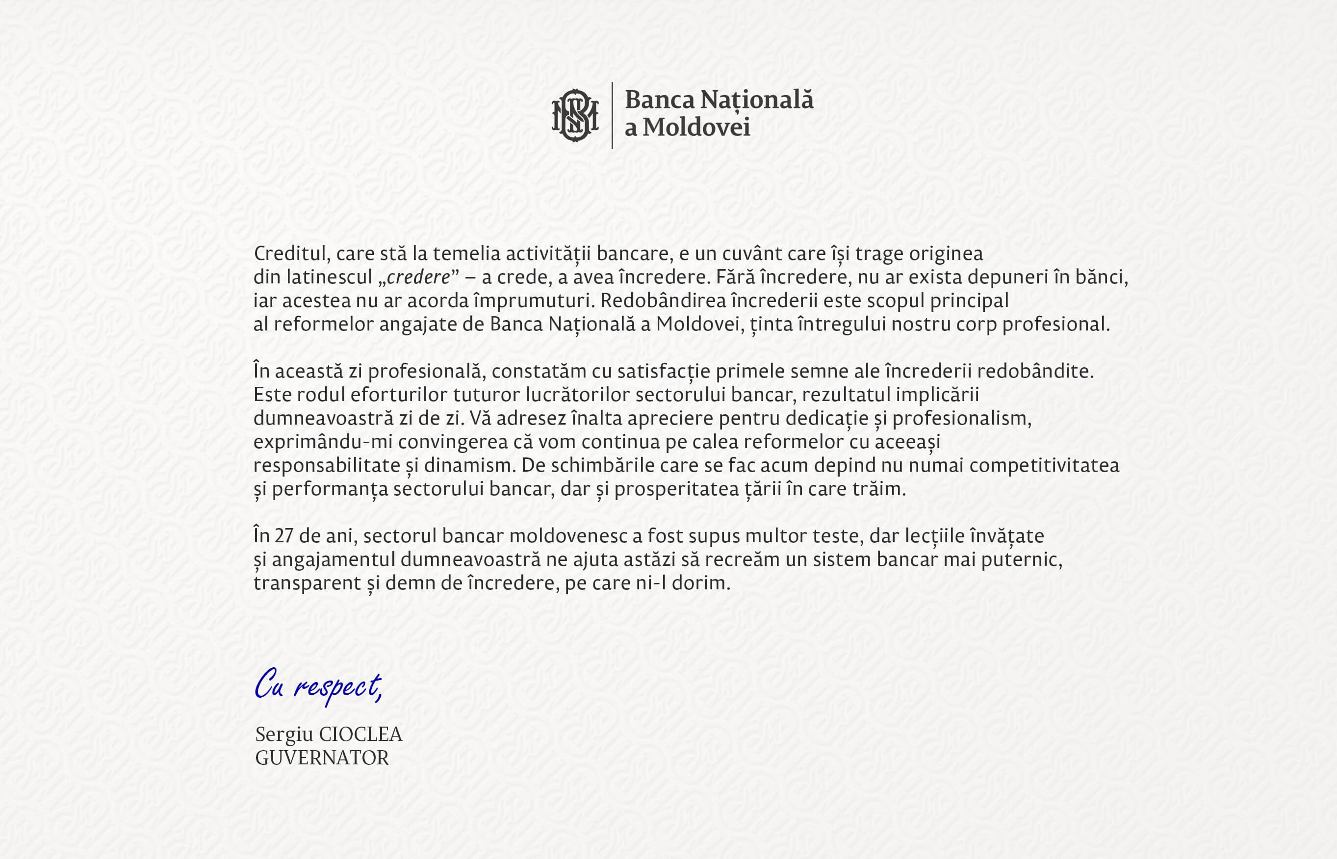 În această zi profesională, constatăm cu satisfacție primele semne ale încrederii redobândite. Este rodul eforturilor tuturor lucrătorilor sectorului bancar, rezultatul implicării dumneavoastră zi de zi. Vă adresez înalta apreciere pentru dedicație și profesionalism, exprimându-mi convingerea că vom continua pe calea reformelor cu aceeași responsabilitate și dinamism. De schimbările care se fac acum depind nu numai competitivitatea și performanța sectorului bancar, dar și prosperitatea țării în care trăim.
