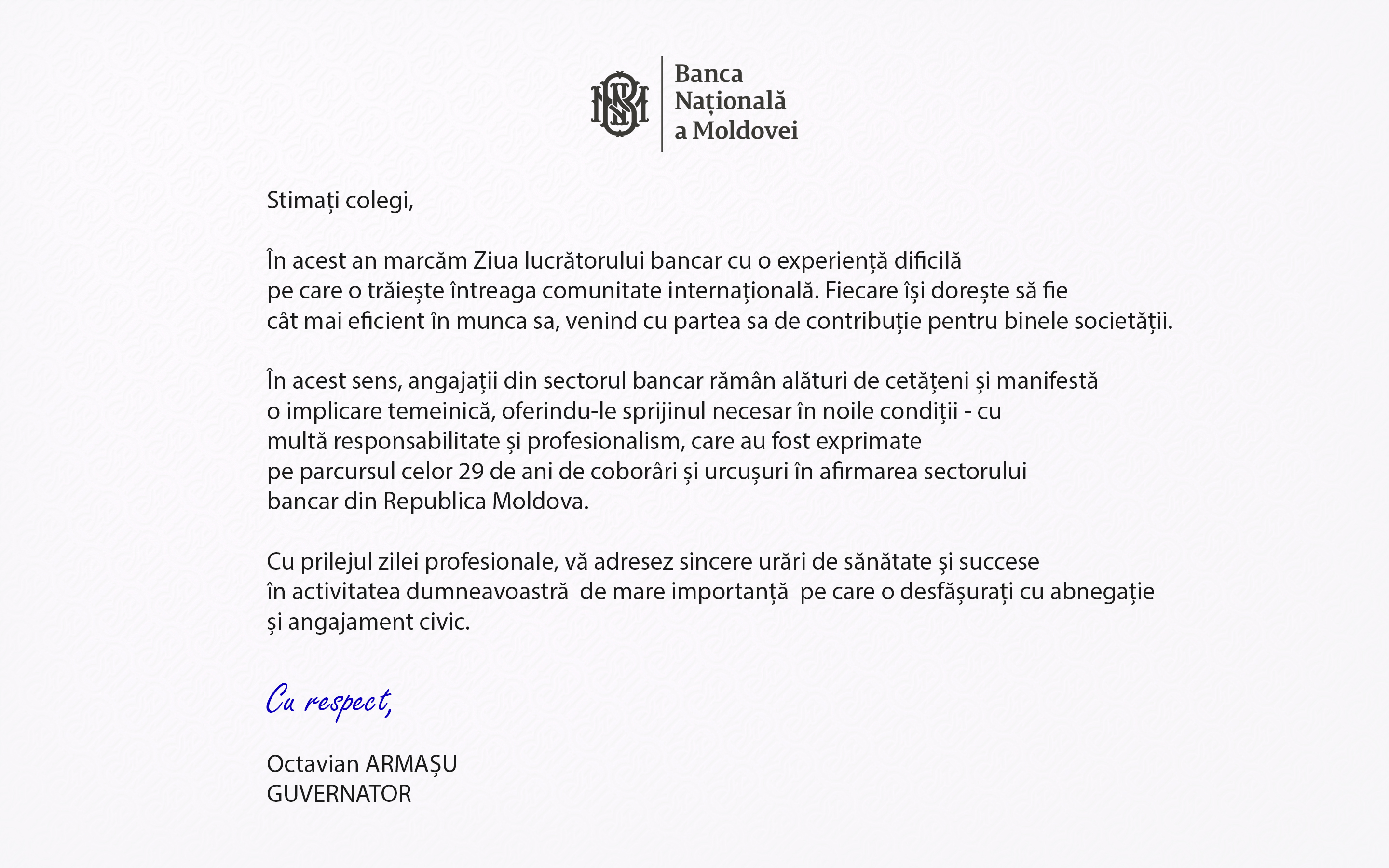În acest an marcăm Ziua lucrătorului bancar cu o experiență dificilă pe care o trăiește întreaga comunitate internațională. Fiecare își dorește să fie cât mai eficient în munca sa, venind cu partea sa de contribuție pentru binele societății.