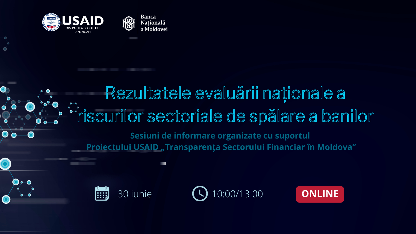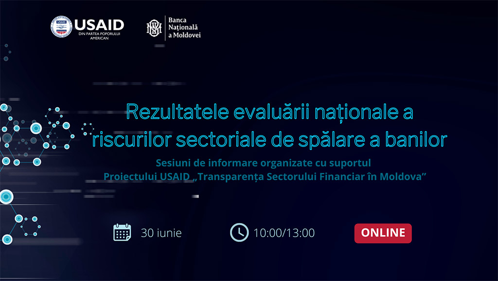 Principalele vulnerabilități legate de spălarea banilor și finanțarea terorismului, identificate în cadrul celei de-a doua evaluări naționale*, precum și recomandările de reducere a acestora vor fi discutate în cadrul a două sesiuni de informare adresate entităților supravegheate de către Banca Națională a Moldovei (BNM). Sesiunile sunt organizate cu suportul Proiectului USAID „Transparența Sectorului Financiar în Moldova” (FSTA) și vor fi moderate de către experți naționali și internaționali în domeniul prevenirii și combaterii spălării banilor și finanțării terorismului (AML/CFT).