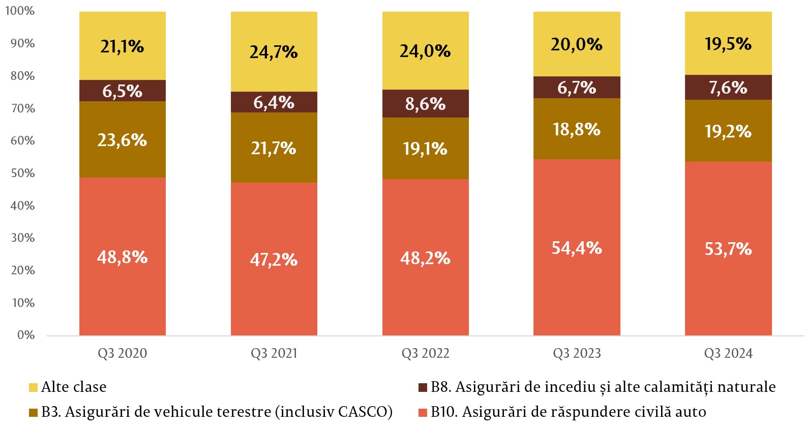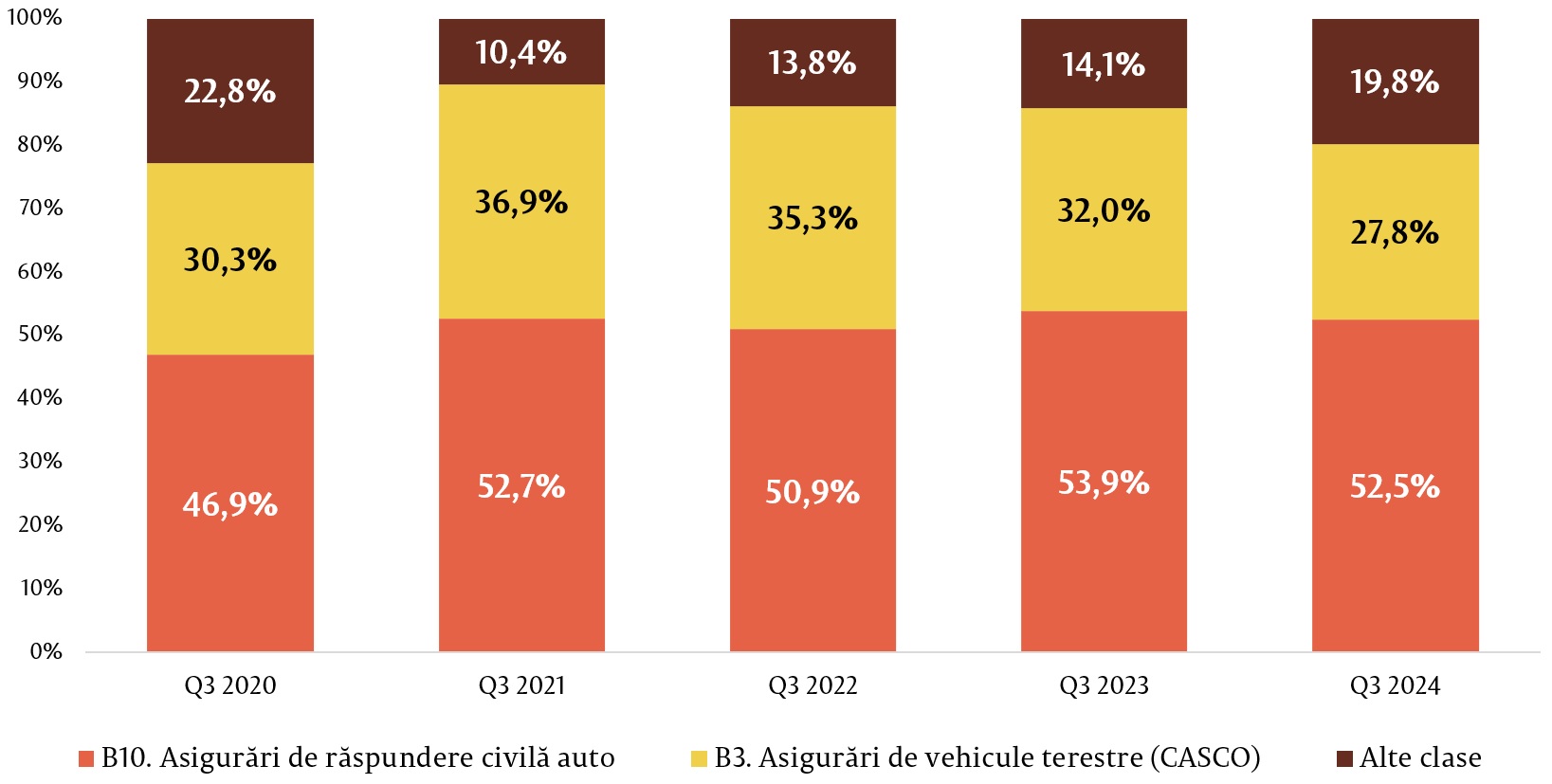 În totalul primelor brute subscrise pentru asigurările generale, cele mai mari ponderi le-au deținut clasele Asigurările obligatorii de răspundere civilă auto (care cuprinde RCA internă, Carte Verde, Carnet TIR, Carnet CMR), Asigurările de vehicule terestre, altele decât cele feroviare (CASCO) și Asigurările de incendiu și alte calamități naturale, cumulând peste 80,5 la sută din piață. Celelalte clase de asigurări cuprind fiecare mai puțin de 122 milioane lei sau 5,2 la sută fiecare.