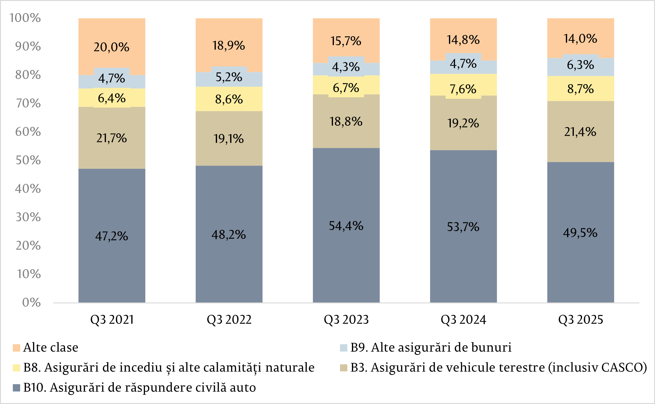 Din totalul primelor brute subscrise pentru asigurările generale, cele mai mari ponderi le-au deținut Asigurările obligatorii de răspundere civilă auto (RCA internă, Carte Verde, Carnet TIR, Carnet CMR) și Asigurările de vehicule terestre, altele decât cele feroviare (CASCO), astfel, asigurările auto cumulând peste 71,0 la sută din piață, urmate de Asigurările de incendiu și alte calamități naturale, pentru care au fost subscrise 8,7 la sută din prime și Alte asigurări de bunuri (preponderent – asigurarea culturilor agricole) cu o cotă de 6,3 la sută din prime. Celelalte clase de asigurări cumulează prime brute subscrise mai puțin de 132,0 milioane lei sau 5,5 la sută fiecare.