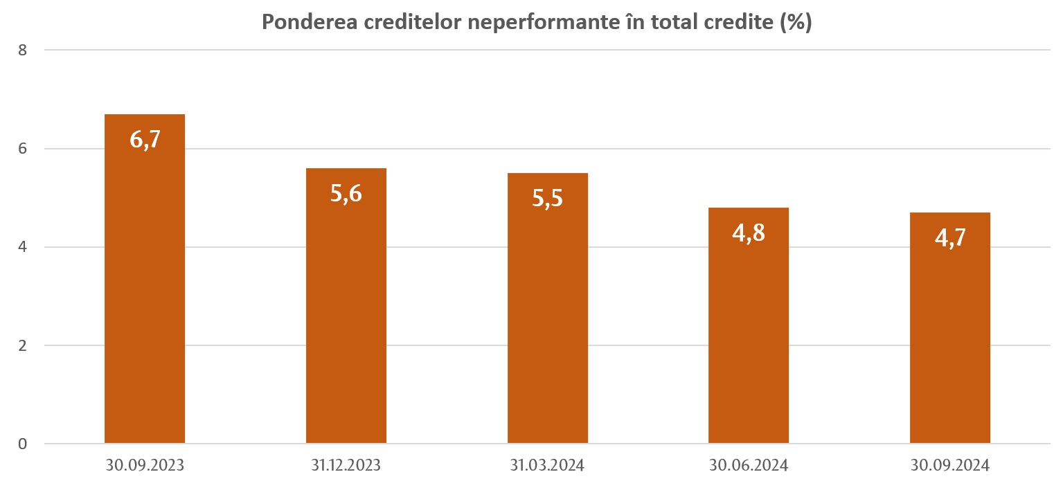 Pe parcursul perioadei de referință, ponderea creditelor neperformante (substandard, dubioase și compromise) în totalul creditelor s-a micșorat cu 0,8 p.p., constituind 4,7% la 30.09.2024, indicatorul menționat variind de la 3,0% până la 6,2%, în funcție de bancă.