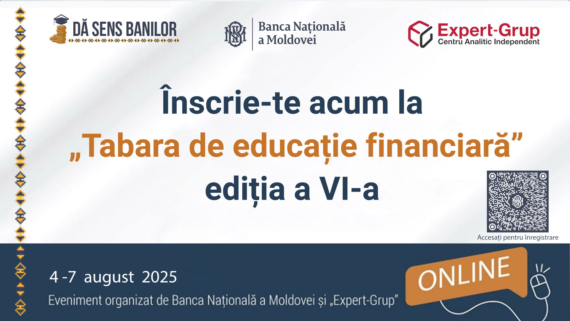 Banca Națională a Moldovei anunță deschiderea înregistrărilor pentru cea de-a VI-a ediție a „Taberei de educație financiară”, organizată online în parteneriat cu Centrul Analitic Independent „Expert-Grup”, în perioada 4–7 august 2025. Evenimentul este destinat tinerilor cu vârsta de minimum 17 ani și oferă o experiență interactivă și accesibilă de familiarizare cu noțiunile financiare de bază.
