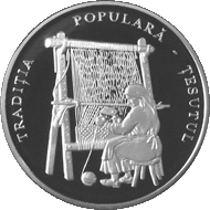• urmînd circumferinţa monedei - cu majuscule este gravată inscripţia „TRADIŢIA POPULARĂ-ŢESUTUL”.