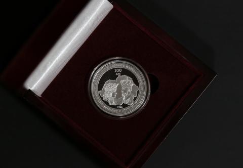 în partea de jos – trei inscripții: „Ag 999”, „100 LEI” și „22,0 g”;