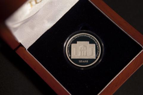 urmînd circumferinţa monedei,cu majuscule sînt gravate inscripţiile: „MUZEUL NAŢIONAL DE ETNOGRAFIE ŞI ISTORIE NATURALĂ” şi „125 ANI”.