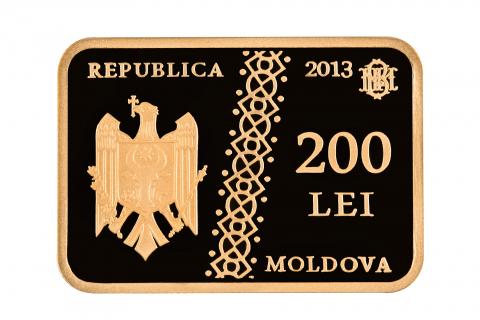 în partea dreaptă – valoarea nominală „200 LEI”, anul emisiunii „2013” şi sigla „BNM”;