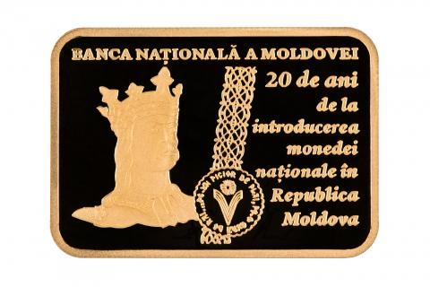 în partea dreaptă este gravată inscripţia „20 de ani de la introducerea monedei naţionale în Republica Moldova”.