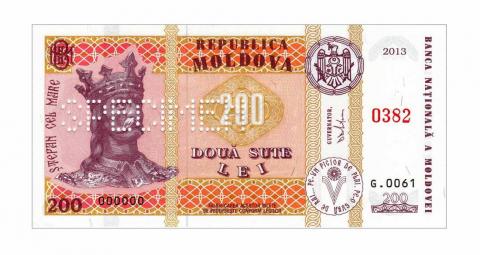 Faţa bancnotei: Stema Republicii Moldova, denumirea băncii emitente "BANCA NAŢIONALĂ A MOLDOVEI", inscripţia "REPUBLICA MOLDOVA", portretul lui Ştefan cel Mare, un ornament naţional multicolor, trei elemente decorative verticale, ghioşul central, valoarea nominală imprimată în cifre şi în litere, sigla "BNM", cuvântul “GUVERNATOR” şi semnătura în facsimil a guvernatorului Băncii Naţionale, textul pe cerc "PE-UN PICIOR DE PLAI, PE-O GURĂ DE RAI...", simbolul Victoriei - "V", anul imprimării bancnotei "2013", numărul şi seria bancnotei, textul "FALSIFICAREA ACESTOR BILETE SE PEDEPSEŞTE CONFORM LEGILOR". |