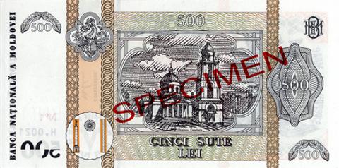 - Relief concav: În partea stîngă a rozetei centrale de pe avers este imprimată în relief concav cifra „500”, care reprezintă valoarea nominală a bancnotei, în partea dreaptă – textul „LEI”.