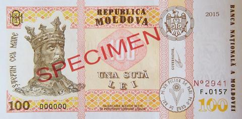 Bancnota modernizată cu valoarea nominală de 100 LEI, specimenul anului 2015, cu semnătura în facsimil a guvernatorului Băncii Naționale - Octavian Armașu.