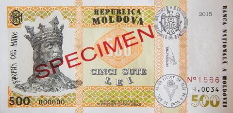 Bancnota modernizată cu valoarea nominală de 500 LEI, specimenul anului 2015, cu semnătura în facsimil a guvernatorului Băncii Naționale - Octavian Armașu.