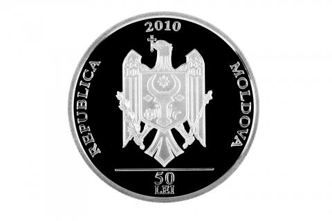 urmând circumferinţa monedei - cu majuscule, este gravată inscripţia „REPUBLICA MOLDOVA”.