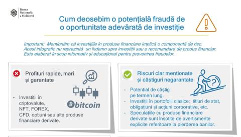 În acest context, Banca Națională îndeamnă cetățenii să se informeze de pe site-uri oficiale și să fie precauți atunci când li se fac promisiuni de profituri mari și rapide. De asemenea, se recomandă prudență maximă față de persoanele care pretind că au cunoștințe și oferă oportunități exclusive de investiții sau față de cei care solicită plăți cu scopul investițiilor, în special dacă cealaltă parte vine cu inițiativa efectuării de investiții.