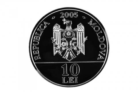 Avers: în plan central-Stema Republicii Moldova; în partea de sus - cifra "2005"; în partea de jos - inscripţia "10 LEI"; urmînd circumferinţa monedei - cu majuscule este gravată inscripţia "REPUBLICA MOLDOVA". |