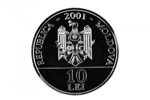 Avers: în plan central - Stema Republicii Moldova; în partea de sus - cifra "2001"; în partea de jos - inscripţia "10 LEI"; urmînd circumferinţa monedei - cu majuscule este gravată inscripţia "REPUBLICA MOLDOVA". |