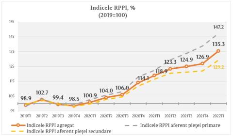 Indicele RPPI aferent prețului de ofertă la bunurile imobile prezentate pe piața primară a înregistrat valoarea de 147,2 la sută, fiind în creștere cu 8,6 la sută față de trimestrul IV 2021 și cu 20,4 la sută față de trimestrul I 2021.