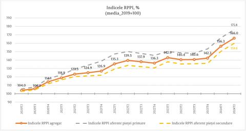 Indicele RPPI aferent prețului de ofertă pentru bunurile imobile din cadrul pieței secundare a înregistrat valoarea de 159,8 la sută, fiind în creștere cu 6,3 la sută față de trimestrul I 2024 și cu 18,1 la sută față de trimestrul II 2023.