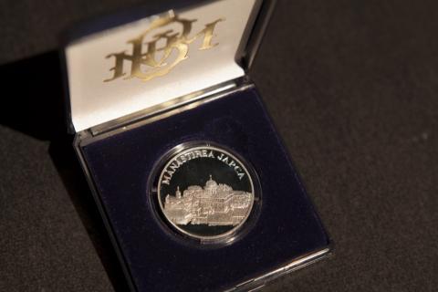 • în partea de sus,urmînd circumferinţa monedei - cu majuscule este gravată inscripţia "MĂNĂSTIREA JAPCA".