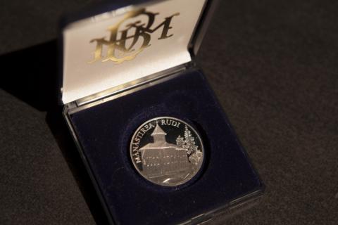 • în partea de sus,urmînd circumferinţa monedei - cu majuscule este gravată inscripţia "MĂNĂSTIREA RUDI".