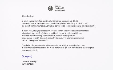 În acest an marcăm Ziua lucrătorului bancar cu o experiență dificilă pe care o trăiește întreaga comunitate internațională. Fiecare își dorește să fie cât mai eficient în munca sa, venind cu partea sa de contribuție pentru binele societății.