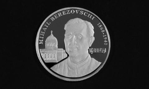 în partea de sus, în exergă, sunt gravate inscripțiile „MIHAIL BEREZOVSCHI” și anii de viață „1868-1940”.