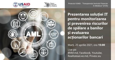 Banca Națională a Moldovei (BNM) va găzdui marți, 20 aprilie 2021, începând cu ora 15:00, un eveniment dedicat implementării unei soluții IT integrate, menită să automatizeze și să eficientizeze procesele de monitorizare a riscurilor de spălare a banilor și a transparenței acționariatului băncilor supravegheate. Soluția IT, care reprezintă o premieră pentru regiune, va fi implementată cu suportul Proiectului „Transparența Sectorului Financiar în Moldova” (FSTA), finanțat de Agenția Statelor Unite pentru Dezvoltare Internațională (USAID).