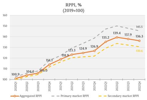 The RPPI associated to the new dwellings listed on the primary market has registered the value of 145.5 percent, that is a 1.5 percent decrease compared to the 3rd quarter of 2022 and a 7.3 percent increase compared to the 4th quarter of 2021.