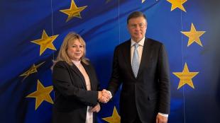În cadrul vizitei de lucru la Bruxelles, guvernatoarea Băncii Naționale a Moldovei, doamna Anca Dragu, a avut astăzi, 1 octombrie 2025, o întrevedere bilaterală cu domnul Valdis Dombrovskis, Comisar european pentru Economie, Productivitate, Implementare și Simplificare.