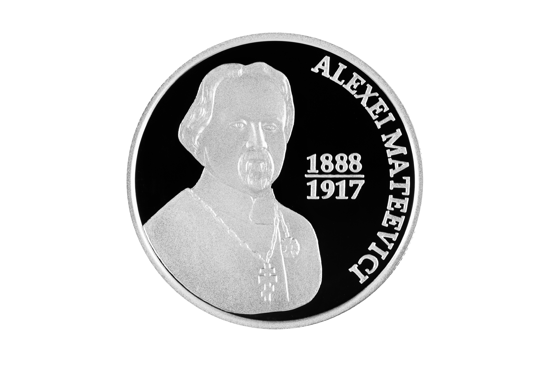 • справа, по окружности монеты, заглавными буквами выгравирована надпись „ALEXEI MATEEVICI”.