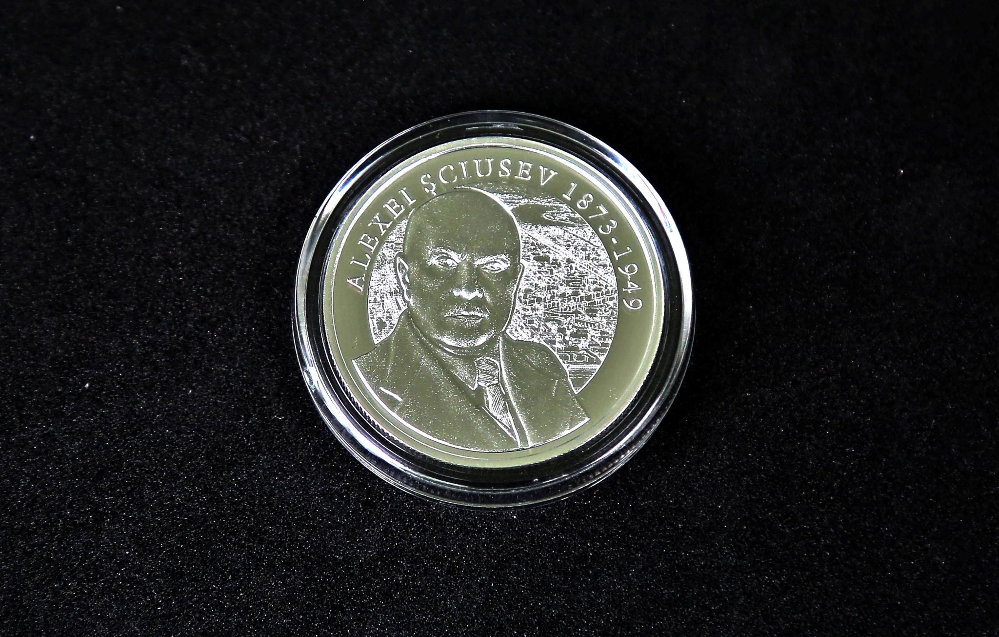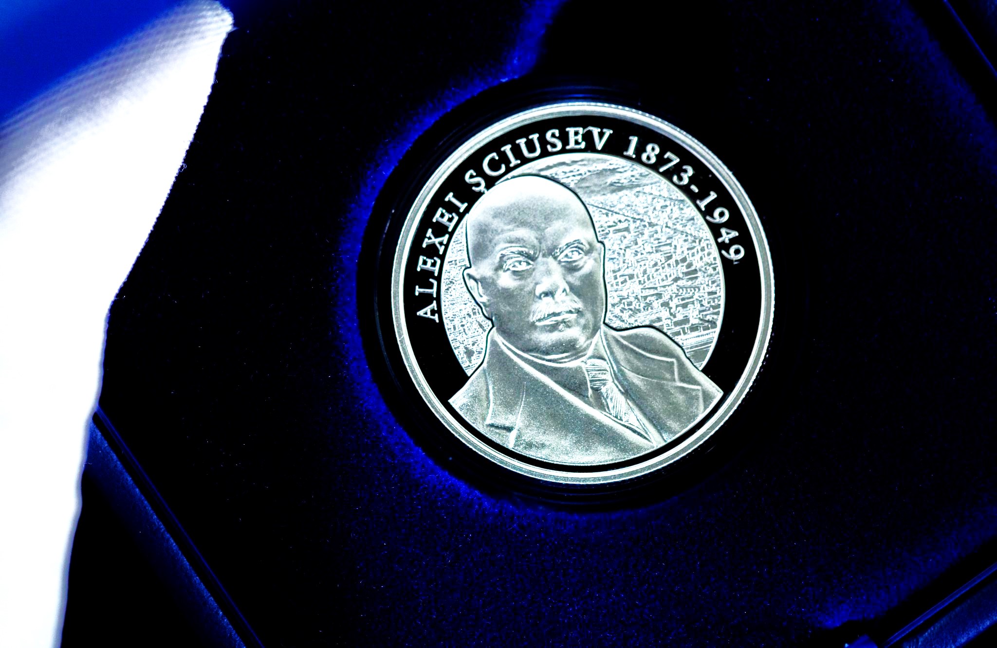 • Портрет и имя Алексея Щусева, годы жизни «1873-1949», на заднем плане изображение Генерального плана реконструкции города Кишинёва.