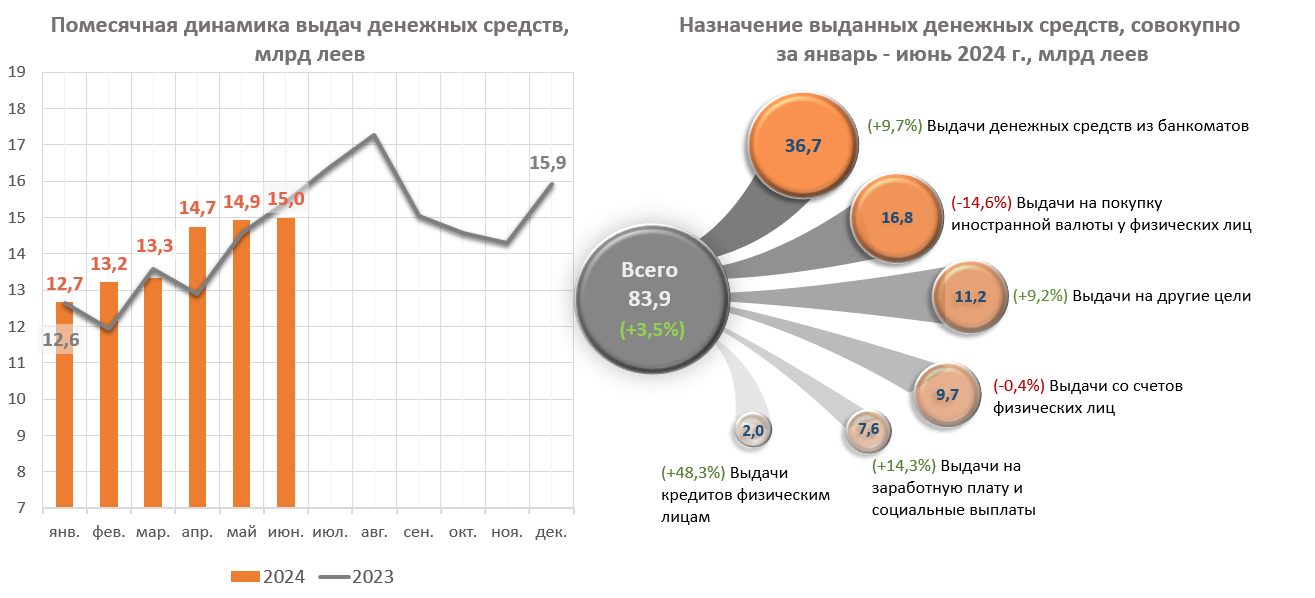 Эта динамика была обусловлена, с одной стороны, увеличением выдачи наличных денежных средств из банкоматов на 3 259,5 млн леев (+9,7%), выдачи наличности на оплату труда и социальные выплаты на 946,8 млн леев (+14,3%) и выдачи наличности в других целях на 941,7 млн леев (+9,2%), а с другой стороны, снижением выдач денежной наличности для покупки валюты у физических лиц на 2 880,8 млн леев (-14,6%).