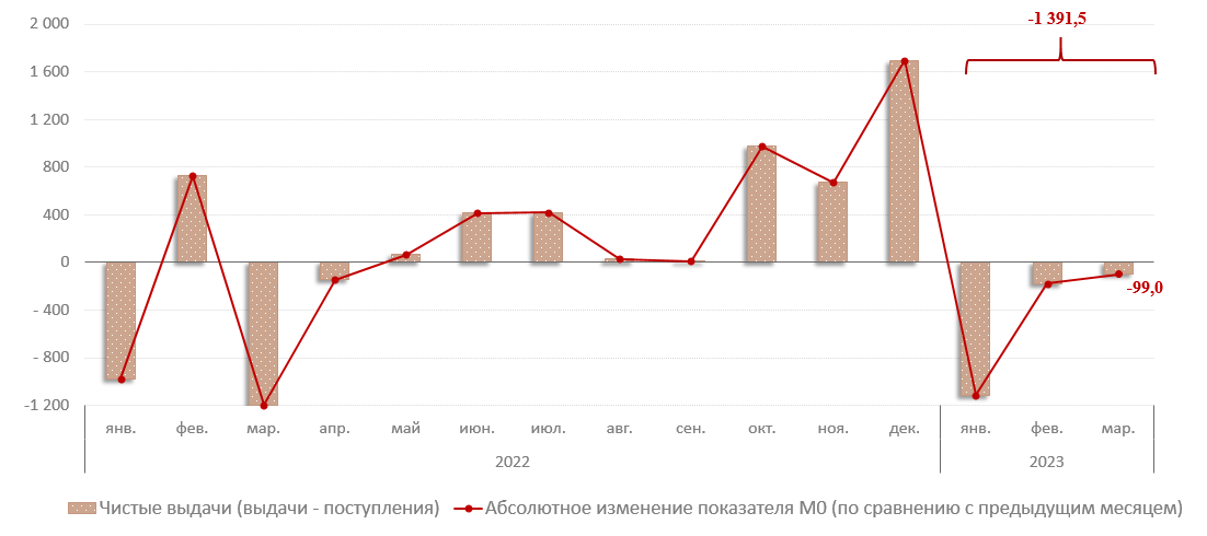 В марте 2023 г., денежная масса M01 (деньги в обращении) составила 33 014,5 млн леев, уменьшившись на 1 391,5 млн леев (-4,0%) по сравнению с декабрем 2022 г. (Диаграмма № 1) в результате снижения в январе – марте 2023 объема совокупных выдач над объемом совокупных поступлений в банковскую систему2 на 1 391,4 млн. леев.