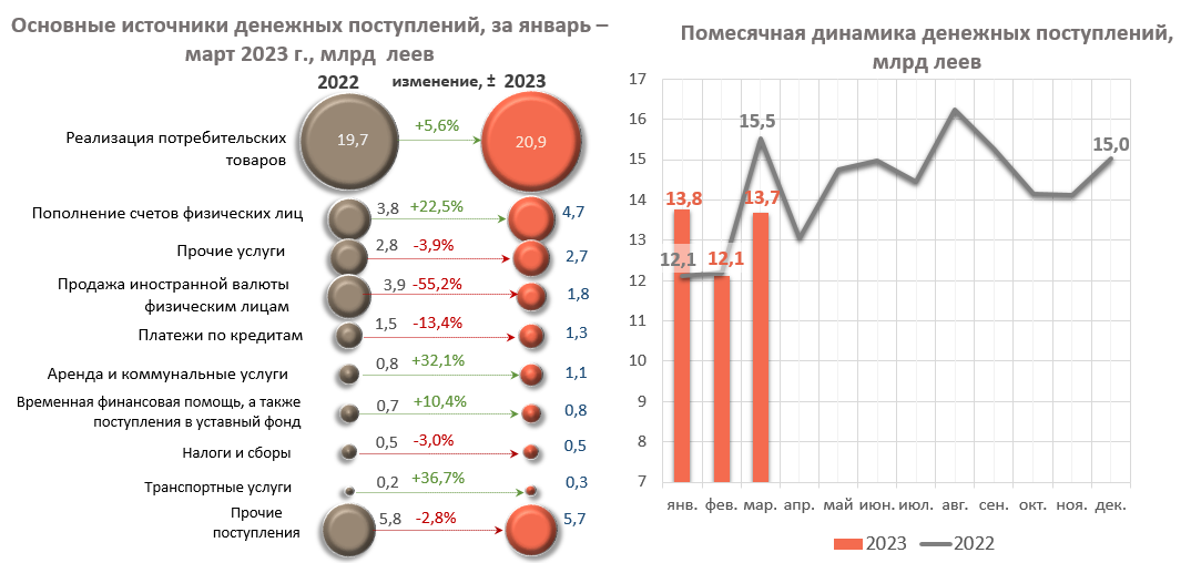 В январе – марте 2023 г. объем денежных поступлений снизился на 274,6 млн леев (-0,7%) по сравнению с тем же периодом прошлого года и составил 39 555,1 млн леев.