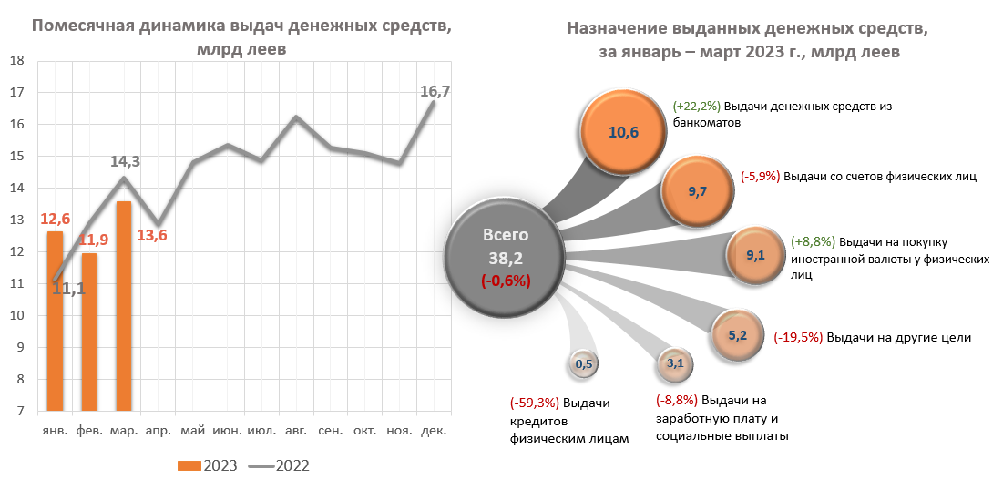 В то же время в январе – марте 2023 г. выдачи денежных средств из банкоматов увеличились на 1 921,3 млн леев (+22,2%) по сравнению с аналогичным периодом предыдущего года, что составило 10 561,4 млн леев, с долей 27,7 процента от общего объема выдачи денежной наличности.