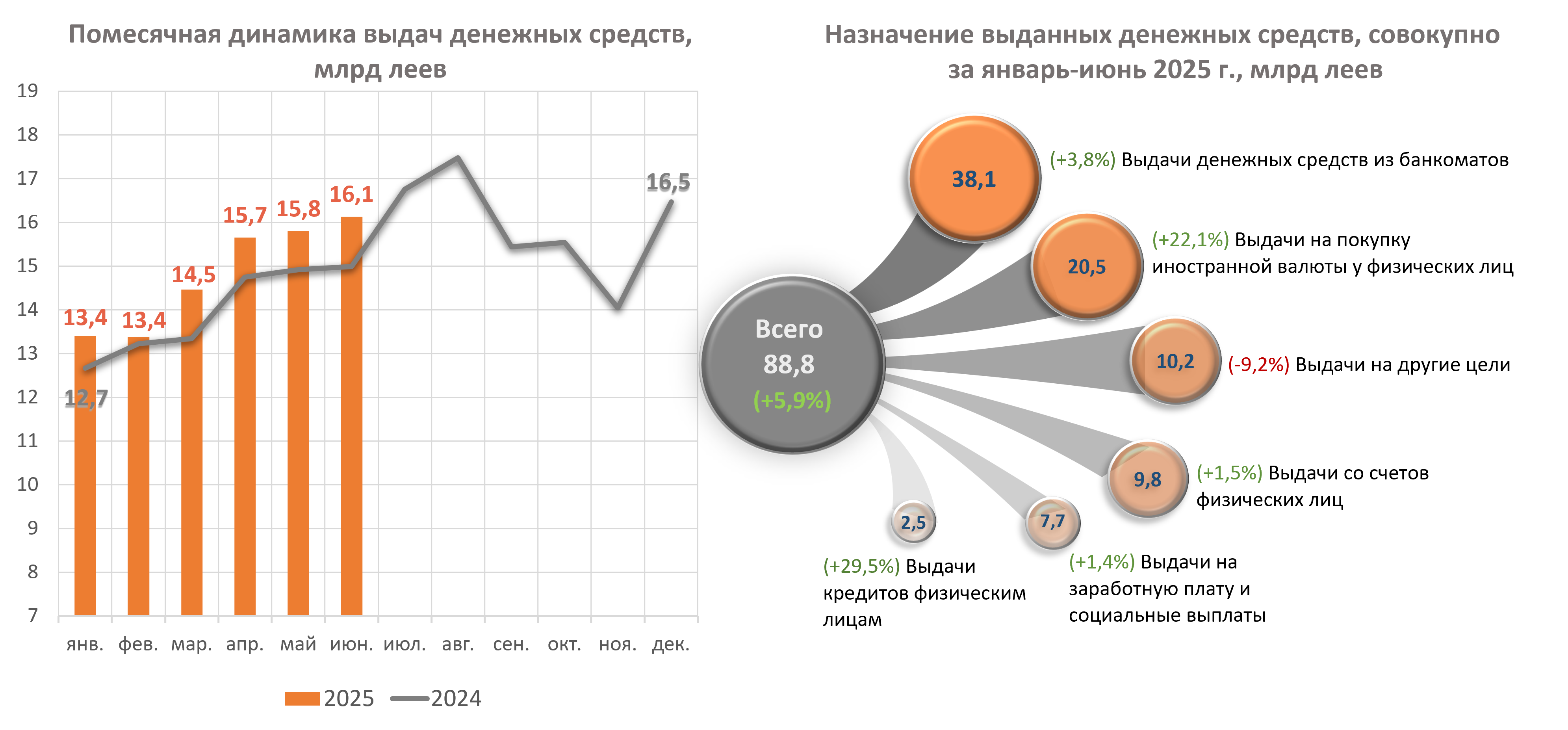 Вместе с тем, в январе-июне 2025 г. выдачи наличности на другие цели снизились на 1 027,9 млн леев (-9,2%).