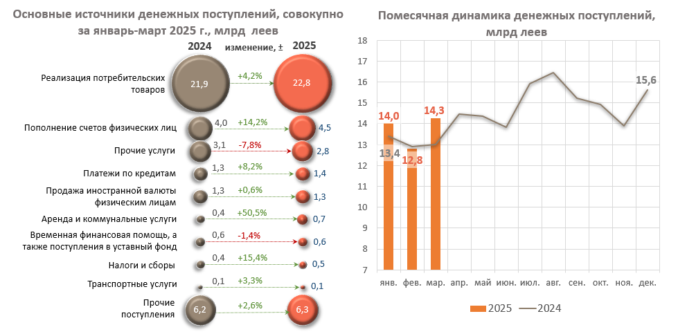 Наличные денежные поступления от продажи потребительских товаров (независимо от канала сбыта) значительно увеличились на 910,2 млн леев (+4,2%), составив 22 802,0 млн леев, что составляет 55,5% от общего объёма наличных денежных поступлений (Диаграмма № 1). Также значительно увеличились поступления наличных денежных средств на текущие и депозитные счета физических лиц на 564,5 млн леев (+14,2%), и поступления от аренды и коммунальных услуг на 221,6 млн леев (+50,5%). Наличные денежные поступления от платежей по кредитам увеличились на 104,1 млн леев (+8,2%).