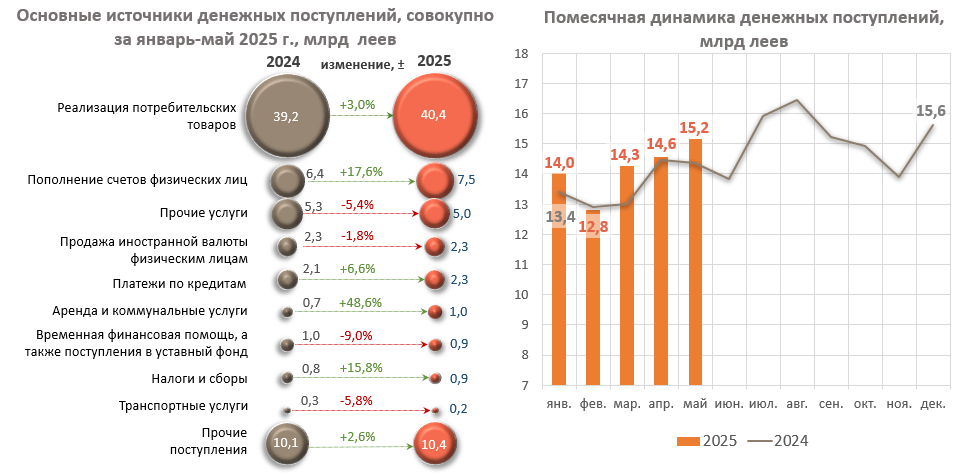 Наличные денежные поступления от продажи потребительских товаров (независимо от каналов их реализации) значительно увеличились на 1 168,2 млн леев (+3,0%), составив 40 402,5 млн леев или 57,0% от общего объёма наличных денежных поступлений (Диаграмма № 1). Также значительно увеличились поступления наличных денежных средств на текущие и депозитные счета физических лиц на 1 121,5 млн леев (+17,6%).