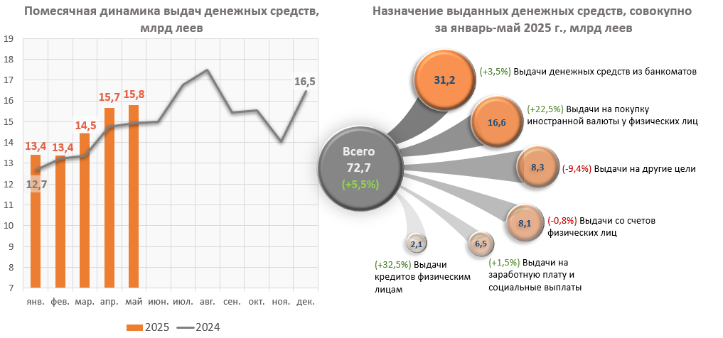 Совокупный объём выдач денежной наличности из касс банков в январе-мае 2025 г. увеличился на 3 784,6 млн леев (+5,5%) по сравнению с аналогичным периодом прошлого года, и составил 72 699,1 млн леев (Диаграмма № 2).