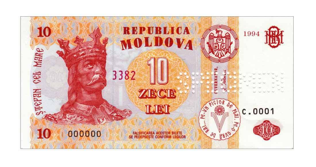 Лицевая сторона: Государственный герб Республики Молдова, надпись "REPUBLICA MOLDOVA", портрет Штефана чел Маре, многоцветный национальный орнамент, два вертикальных декоративных элемента, центральный гильош, номинальная стоимость в цифрах и буквах, художественно оформленная аббревиатура "BNM", факсимиле " GUVERNATOR, L. Talmaci", надпись по кругу "PE-UN PICIOR DE PLAI, PE-O GURĂ DE RAI...", стилизованное изображение литеры "V", год выпуска "1994", номер и серия банкноты, надпись "FALSIFICAREA ACESTOR BILETE SE PEDEPSEŞTE CONFORM LEGILOR"; |