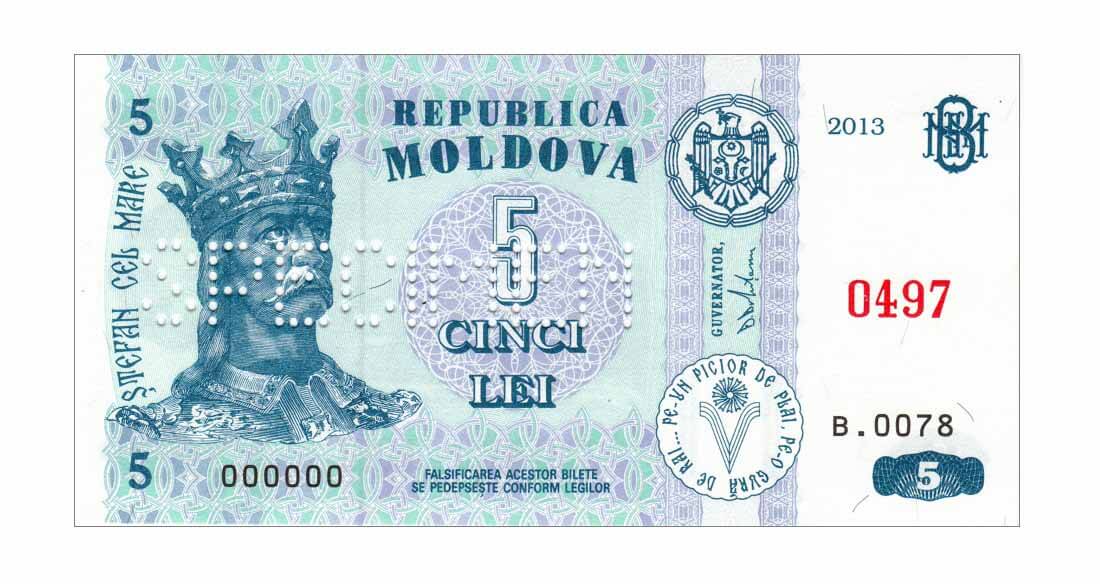 Лицевая сторона: Государственный герб Республики Молдова, надпись "REPUBLICA MOLDOVA", портрет Штефана чел Маре, многоцветный национальный орнамент, два вертикальных декоративных элемента, центральный гильош, номинальная стоимость в цифрах и буквах, художественно оформленная аббревиатура "BNM", факсимиле " GUVERNATOR, Д. Дрэгуцану", надпись по кругу "PE-UN PICIOR DE PLAI, PE-O GURĂ DE RAI...", стилизованное изображение литеры "V", год выпуска "2013", номер и серия банкноты, надпись "FALSIFICAREA ACESTOR BILETE SE PEDEPSESTE CONFORM LEGILOR"; |