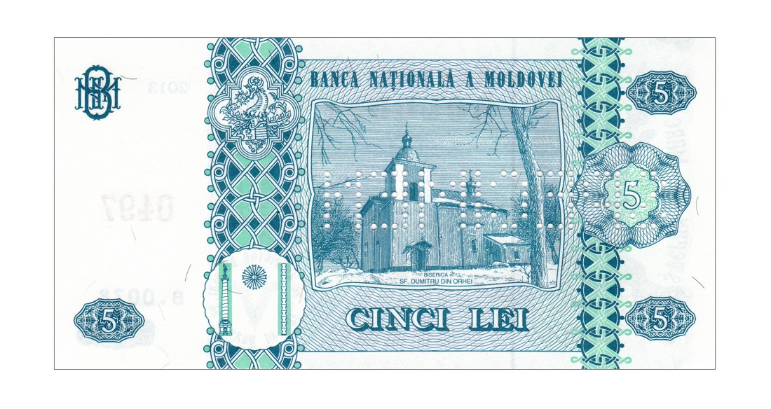 Оборотная сторона: Внутри рамы графическое изображение Церкви св. Думитру из Орхей и надпись "BISERICA SF.DUMITRU DIN ORHEI", номинальная стоимость в цифрах и буквах, два вертикальных декоративных элемента, герб Штефана чел Маре, стилизованное изображение колонны Трaяна, Колонны Бесконечности и между ними полумесяц, название эмиссионного банка "BANCA NATIONALA A MOLDOVEI", художественно оформленная аббревиатура "BNM". |