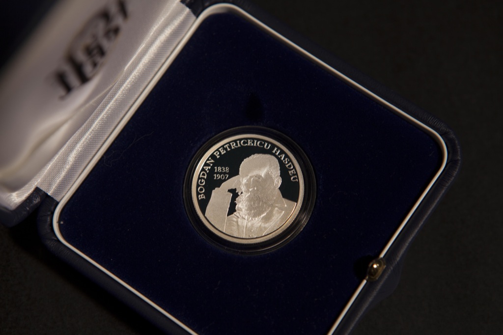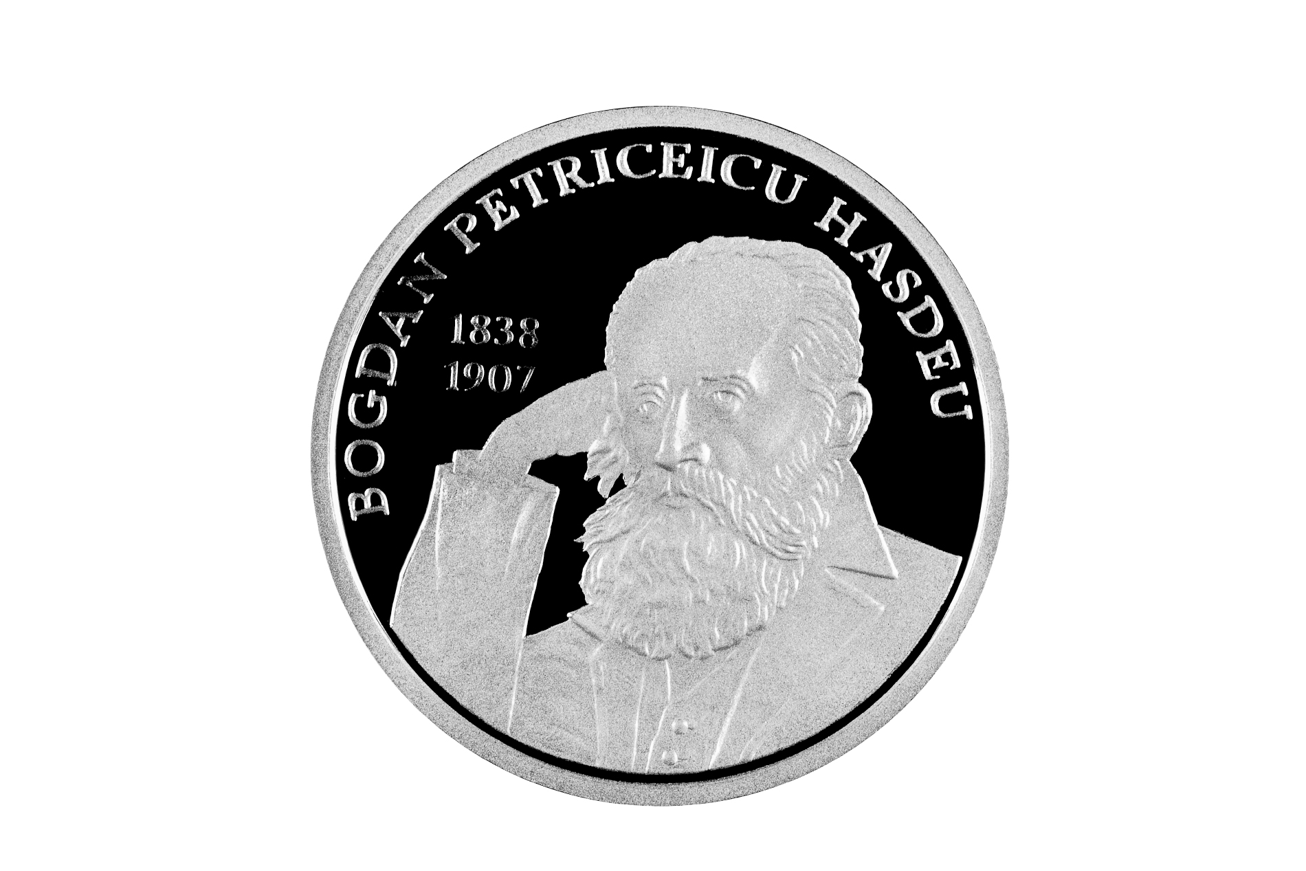 • в верхней части по окружности монеты - заглавными буквами выгравированы надпись „ BOGDAN PETRICEICU HASDEU ” и даты „1838-1907”.
