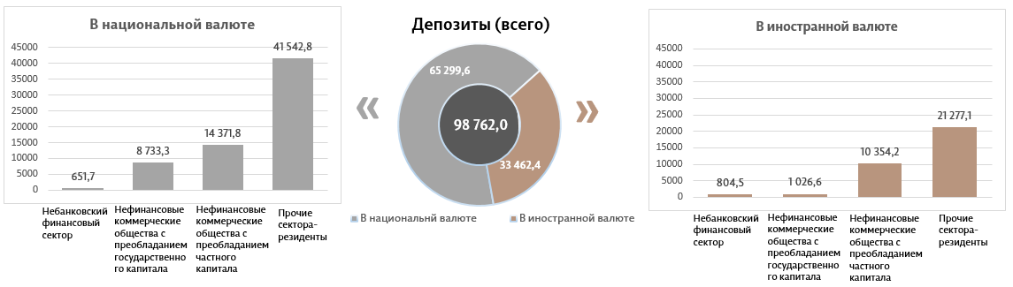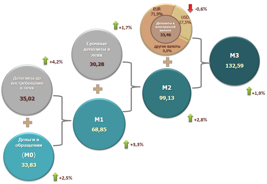 Сальдо депозитов в национальной валюте увеличилось на 1 904,8 миллиона леев по сравнению с предыдущим месяцем и составило 65 299,6 миллиона леев, составив долю 66,1% от общего сальдо депозитов. В то же время сальдо депозитов в иностранной валюте (пересчитанное в леях) снизилось на 214,3 миллиона леев по сравнению с предыдущим месяцем, до уровня 33 462,4 миллиона леев, с долей 33,9% (диаграмма 3).
