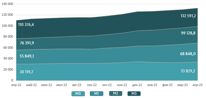 Денежная масса M36 увеличилась на 2 505,1 миллиона леев (+1,9%) по сравнению с мартом 2023 и составила 132 591,2 миллиона леев, на 20,1% выше по сравнению с тем же периодом прошлого года.
