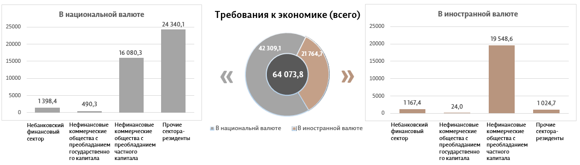 10. Требования к национальной экономике представляют собой требования банковской системы Республики Молдова (включая банки, находящиеся в процессе ликвидации), в национальной валюте и в иностранной валюте, к нефинансовым коммерческим компаниям с преобладающим государственным или частным капиталом, к другие секторам резидентам. В этот показатель входят: кредиты и займы (включая просроченную задолженность), непогашенные проценты по кредитам; долговые ценные бумаги и акции; другие требования.
