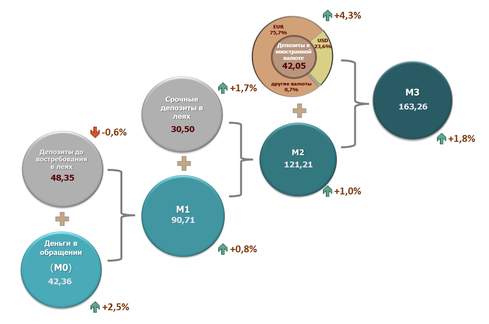 4. Денежная масса М1 включает деньги в обращении (М0) и депозиты до востребования резидентов в молдавских леях..