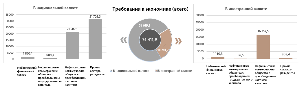 10. Требования к национальной экономике представляют собой требования банковской системы Республики Молдова (включая банки, находящиеся в процессе ликвидации), в национальной валюте и в иностранной валюте, к нефинансовым коммерческим компаниям с преобладающим государственным или частным капиталом, к другие секторам резидентам. В этот показатель входят: кредиты и займы (включая просроченную задолженность), непогашенные проценты по кредитам; долговые ценные бумаги и акции; другие требования.