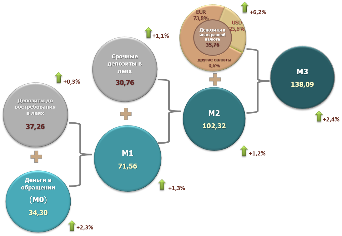 5. Денежная масса М2 включает денежный агрегат (М1), срочные депозиты резидентов в молдавских леях и инструменты денежного рынка..