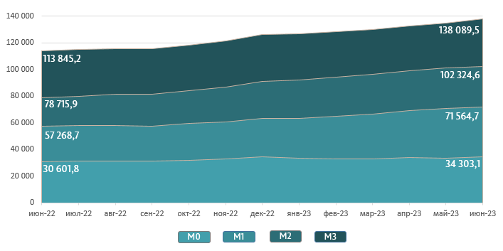 Денежная масса M36 увеличилась на 3 302,2 миллиона леев (+2,4%) по сравнению с маем 2023 г. и составила 138 089,5 миллиона леев, на 21,3% выше по сравнению с тем же периодом прошлого года.